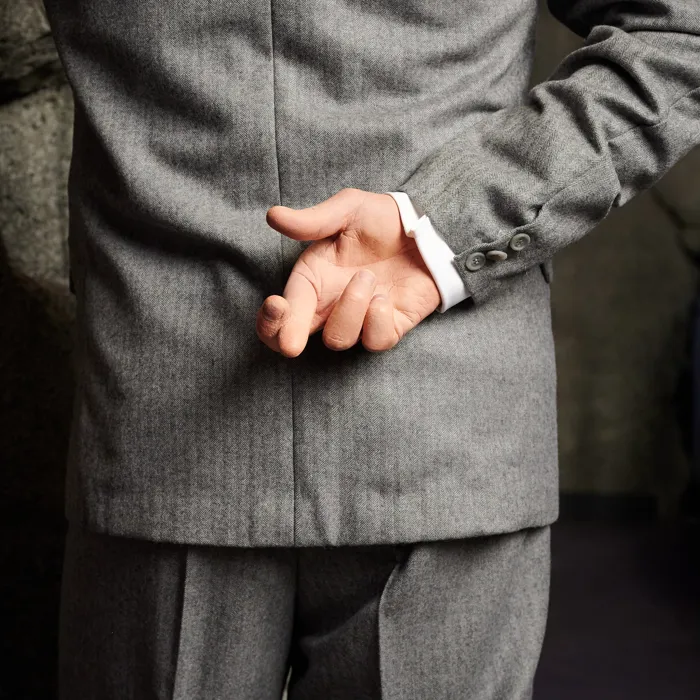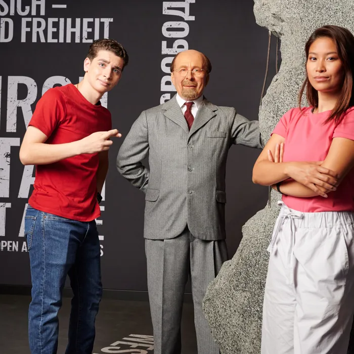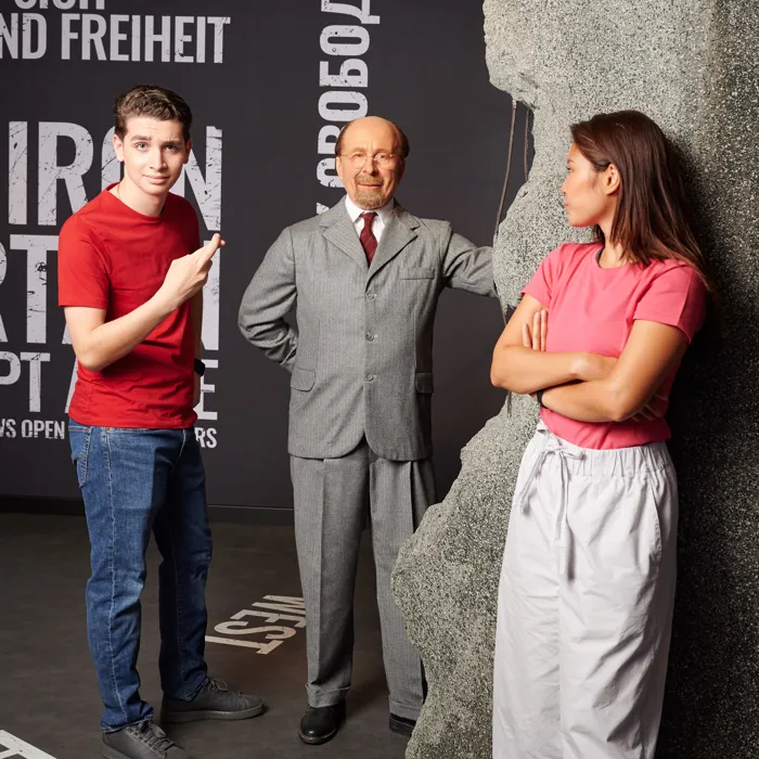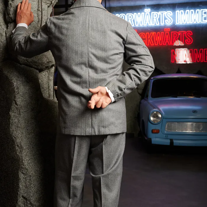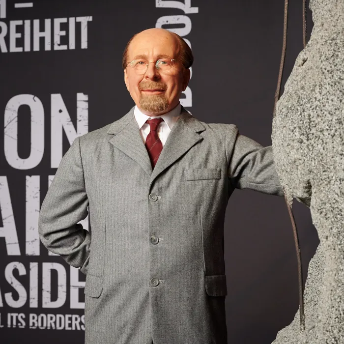 At Madame Tussauds Berlin, Ulbricht is depicted with his fingers crossed behind his back because of his lie about building the Wall.