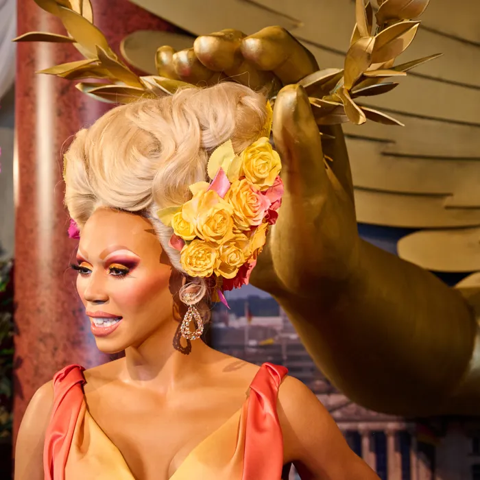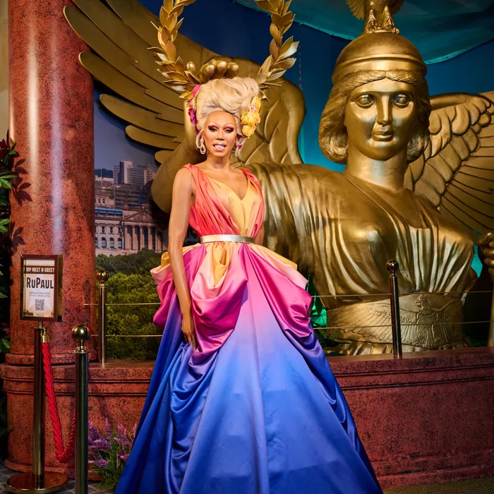 The figure of RuPaul wears a dress inspired by the iconic rainbow satin gown designed by Zaldy. RuPaul originally wore the dress in 2013 for promotional photos of his perfume ColorEvolution and again in Drag Race Season 6, Episode 7. Zaldy, who has been collaborating with RuPaul since 1992, has won three Emmys for his spectacular designs.