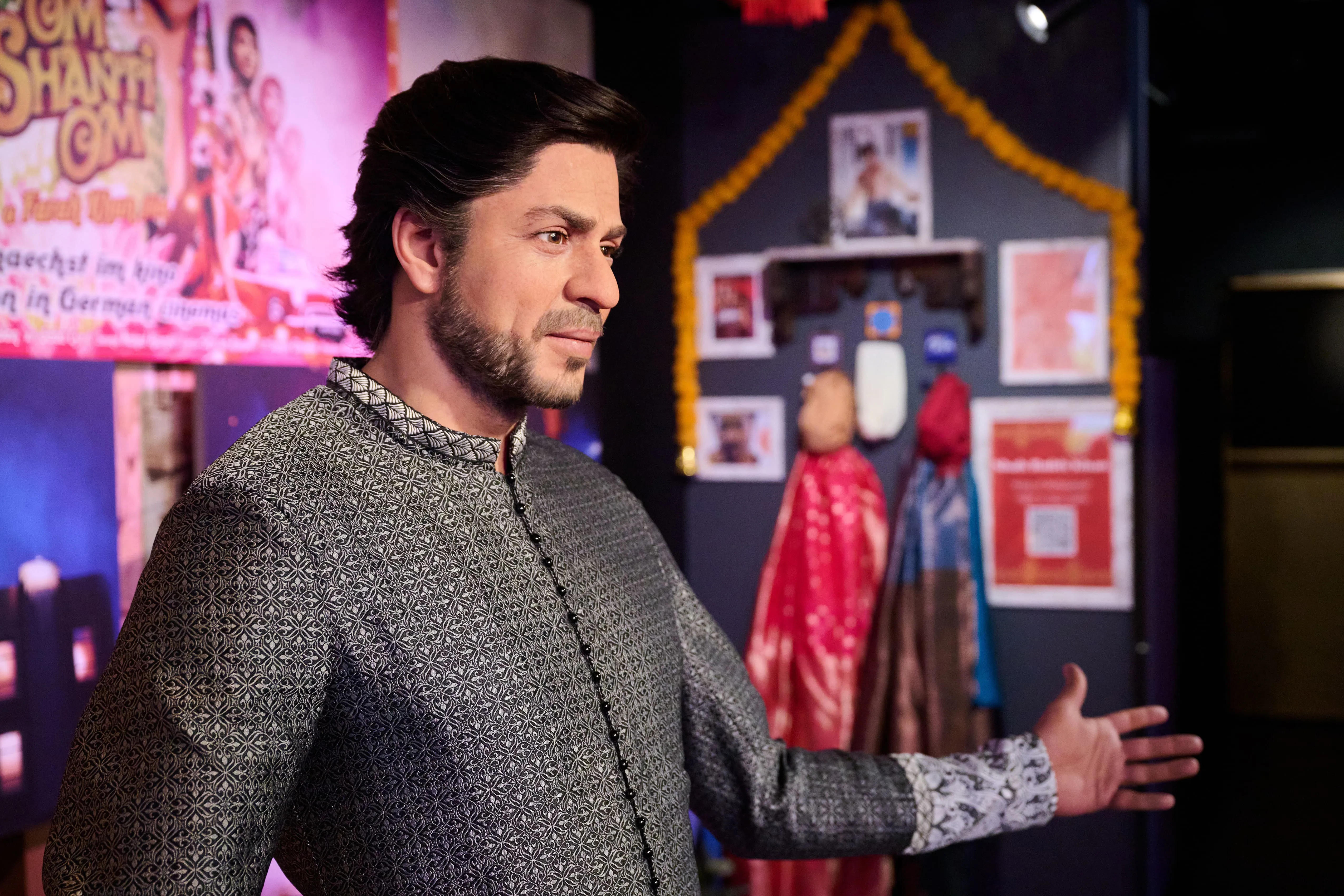 The figure wears a custom-designed Sherwani, inspired by an outfit Shah Rukh Khan wore during a major show in Mumbai in 2017 – blending classic Bollywood elegance with modern craftsmanship.