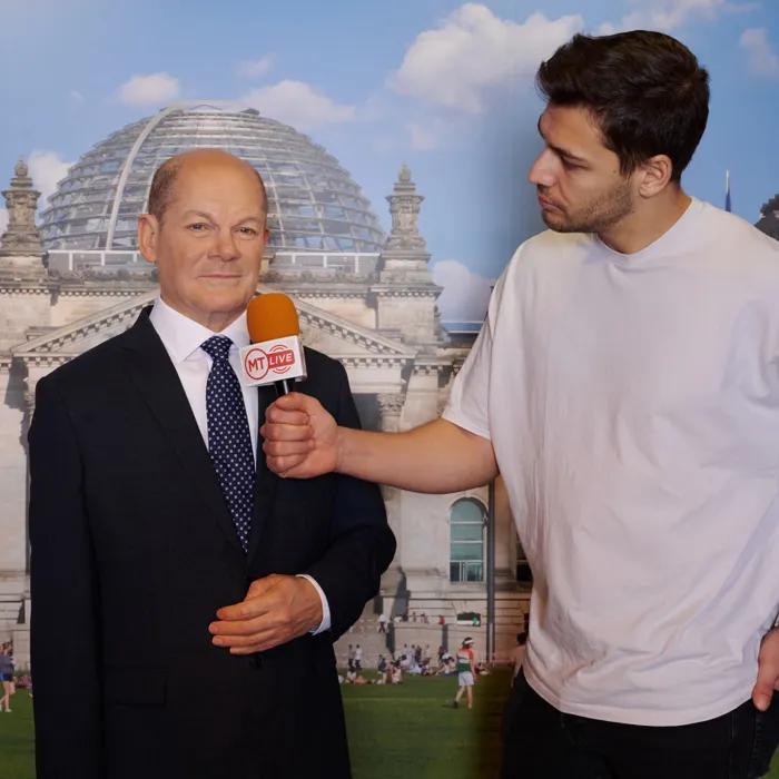 The wax figure of German Chancellor Olaf Scholz in front of the Chancellery shortly before moving into Madame Tussauds Berlin.