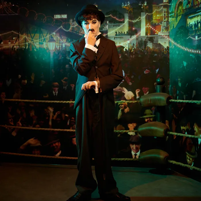 In der Rolle des "Tramps" wird Charlie Chaplin auch im Madame Tussauds Berlin dargestellt. Charakteristisch sind der Zweifingerschnurbart, eine übergroße Hose und Schuhe sowie der Bambusstock und der zu kleine Melonen-Hut auf dem Kopf.