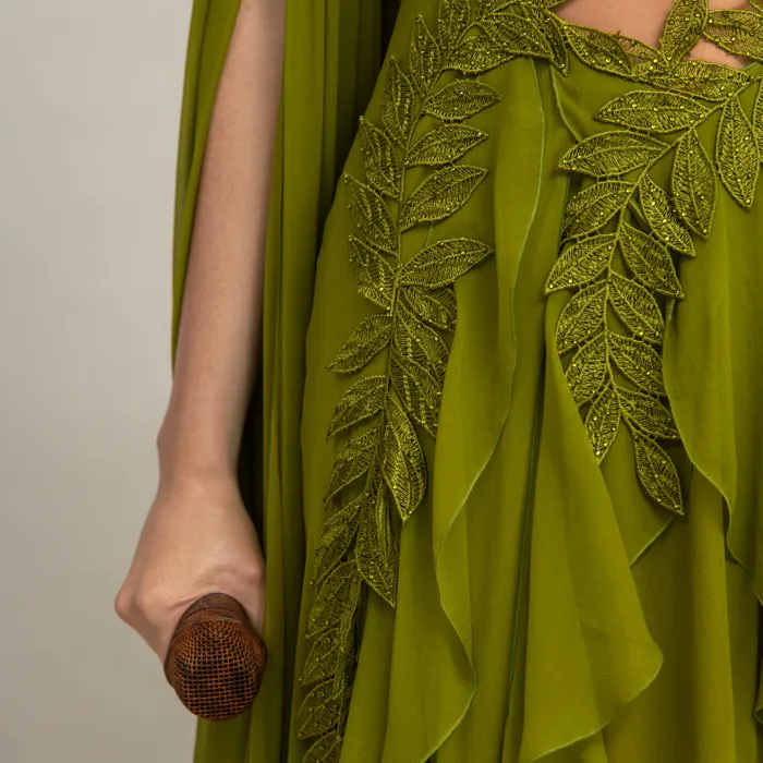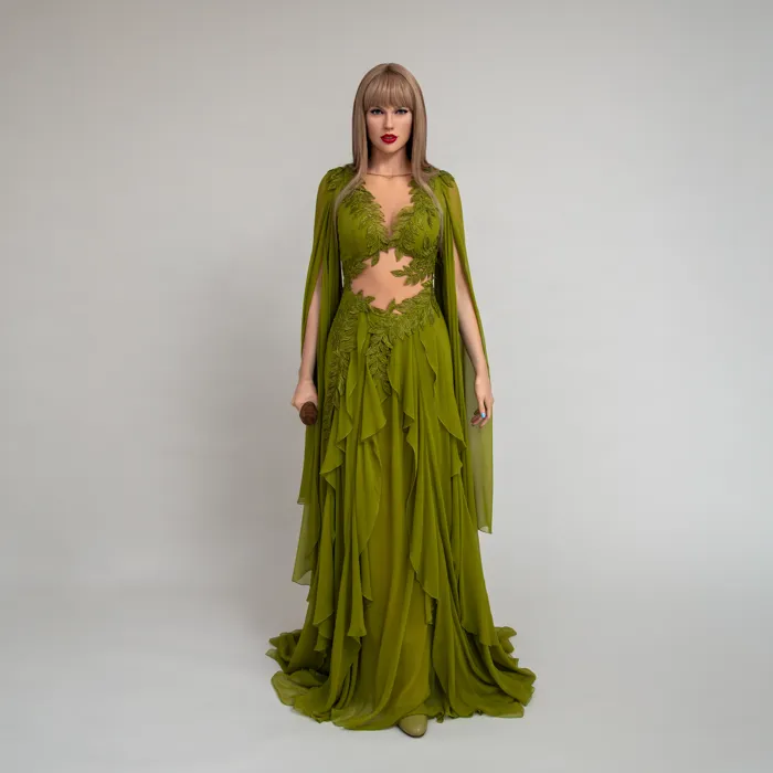 造型搭配綠色繫帶靴,以及由英國Rebel Stage Gear打造的專屬定制麥克風。英國Rebel Stage Gear是一間專業客製化公司,為《Taylor Swift | The Eras Tour》巡迴演唱會的麥克風製作方。