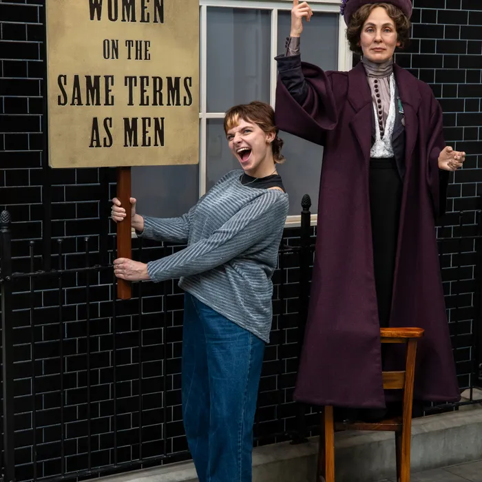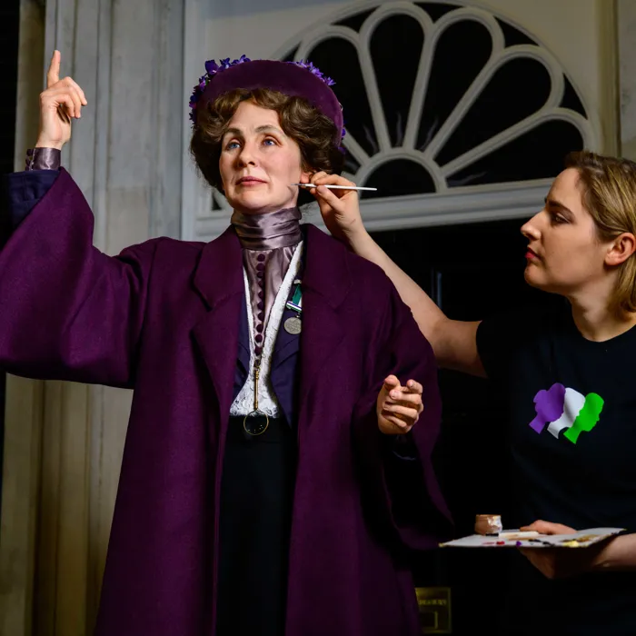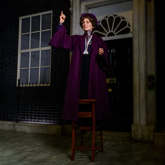 Emmeline's figure is dressed in the Suffragette movement's colours: green, white and purple. Take a look at her hunger strike medal on her lapel!