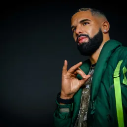 Drizzy is wearing a camouflage t-shirt and cargo trousers, topped with a green parachute bomber jacket and white Nike Air Force 1 trainers. Check out his Cartier and Van Cleef replica jewellery - classic Drake drip!