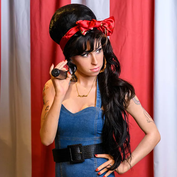 Amy's look is inspired by her 2007 MTV Europe Music Awards outfit. The denim dress and red bandana really show off her London style.