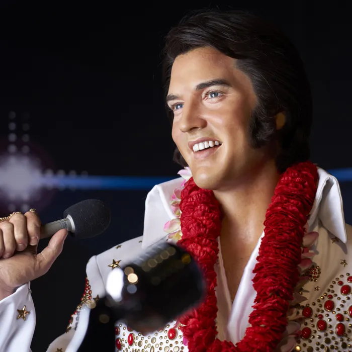50年代のリーゼントブームの立役者、エルヴィス・プレスリーが、ここお台場に君臨しました。ロックンロールな衣装も必見です!