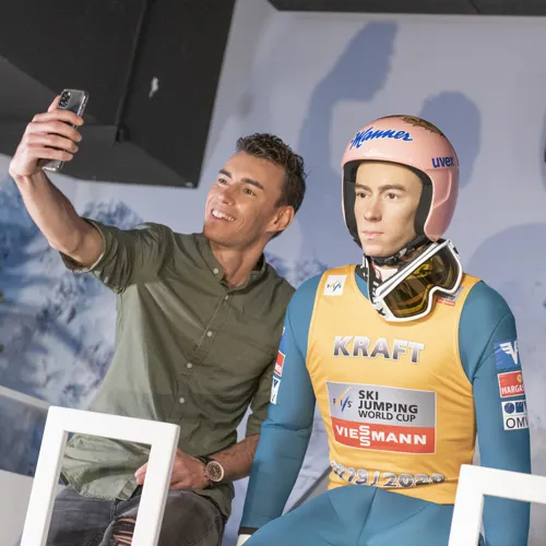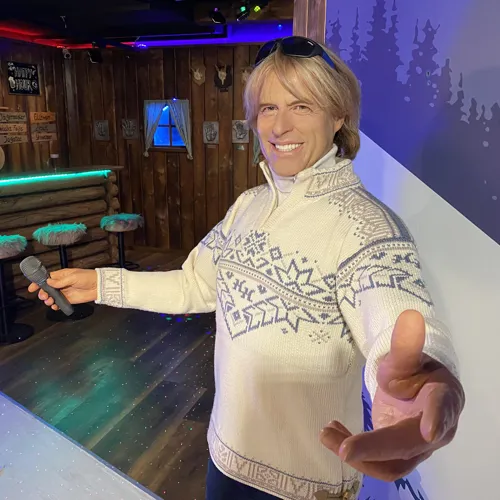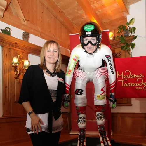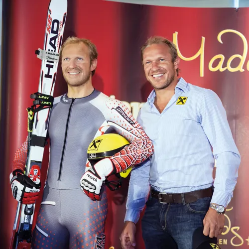Triff die Wachsfigur von Hermann Maier - dem "Herminator" - im Ski-Outfit und posiere mit winterlicher Kleidung neben ihm.